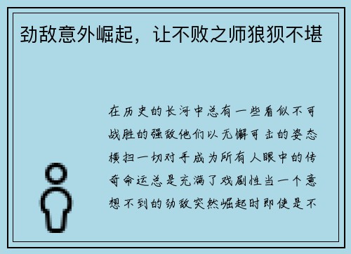在历史的长河中,总有一些看似不可战胜的强敌,他们以无懈可击的姿态横扫一切对手,成为所有人眼中的传奇。命运总是充满了戏剧性,当一个意想不到的劲敌突然崛起时,即使是不败之师,也可能遭遇前所未有的挫折。 故...