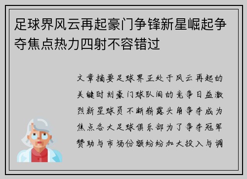 足球界风云再起豪门争锋新星崛起争夺焦点热力四射不容错过