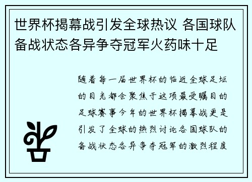 随着每一届世界杯的临近,全球足坛的目光都会聚焦于这项最受瞩目的足球赛事。今年的世界杯揭幕战更是引发了全球的热烈讨论,各国球队的备战状态各异,争夺冠军的激烈程度让赛事的火药味愈加浓烈。从揭幕战的高期待到各支队伍的不同策略,比赛的激烈程度和意外因素不断涌现,使得世界杯成为一场全民的狂欢。本篇文章将从四个方面来探讨世界杯揭幕战引发全球热议的原因,首先是各国球队的备战状态差异,其次是球队对于冠军的强烈渴望,再来是比赛中的火药味及其背后的复杂情绪,最后分析如何通过战略布局来争夺世界杯的最终胜利。