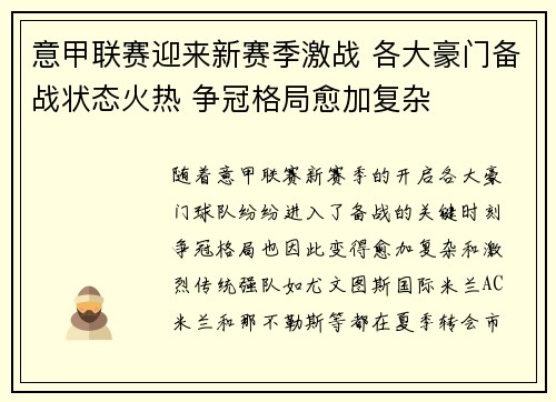 综上所述,意甲联赛新赛季的争冠格局已经变得愈加复杂,各大豪门都在通过转会和战术调整提升自己的实力。尤文图斯、国际米兰、AC米兰和那不勒斯等球队的竞争力都非常强,而一些中型球队的崛起,更是让整个联赛的局面充满了不确定性。本赛季的意甲注定将是一场精彩纷呈的争夺,豪门之间的对决值得每一位球迷的期待。