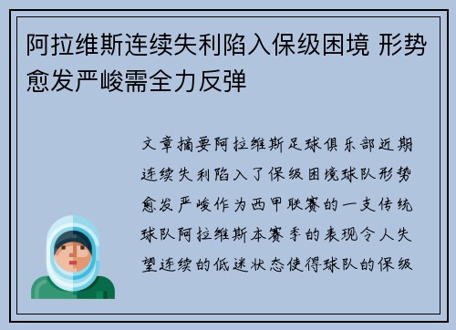 阿拉维斯足球俱乐部近期连续失利,陷入了保级困境,球队形势愈发严峻。作为西甲联赛的一支传统球队,阿拉维斯本赛季的表现令人失望,连续的低迷状态使得球队的保级压力陡然增加。在目前的赛季进程中,阿拉维斯正面临着多方面的挑战,包括战术层面的瓶颈、球员状态的低迷、伤病困扰以及心理层面的焦虑。这些因素的交织,使得阿拉维斯不得不在接下来的比赛中全力反弹,力争摆脱困境,确保留在西甲联赛之中。本文将从四个方面详细分析阿拉维斯当前的困境,并提出其反弹的必要性及策略。